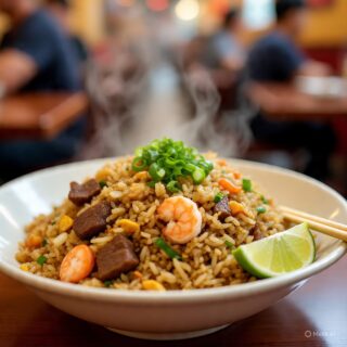 Fresh sea food rice with prawn, fish, cattle fish, crab & sea shell.